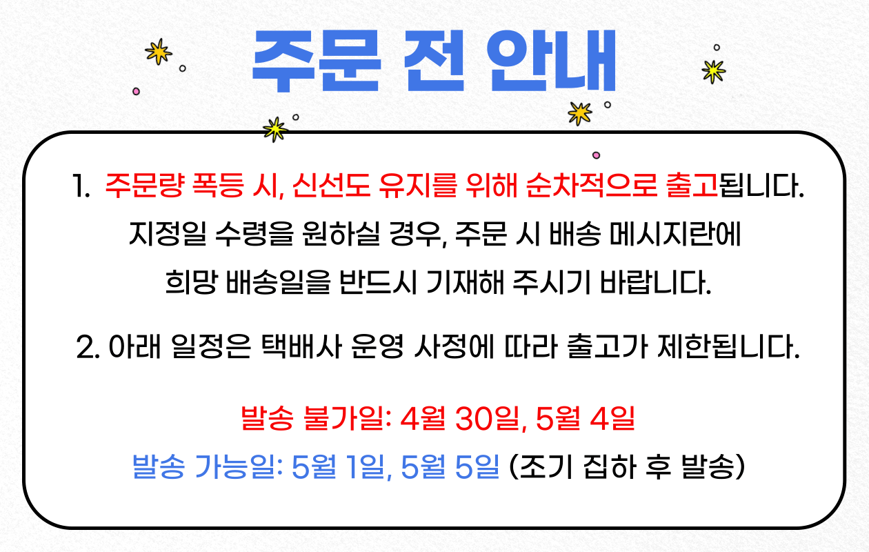 배송지나 택배사 사정 등으로 변경될 수 있습니다.