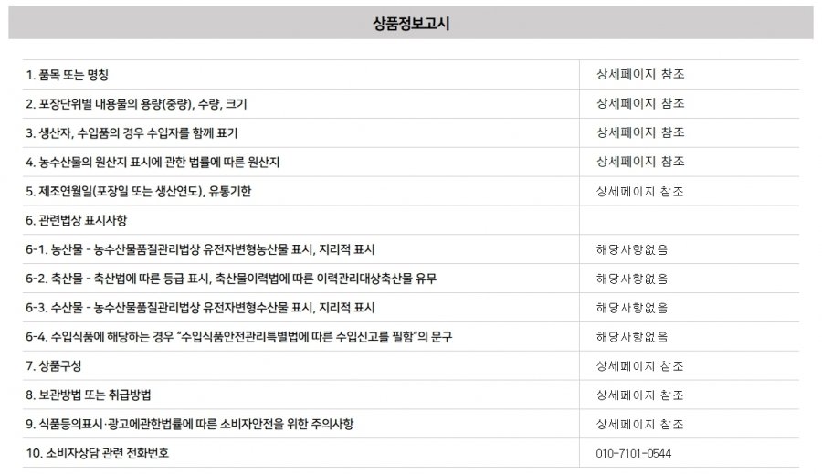 | 식품 등의 표시, 광고에 관한 법률에 따른 소비자안전을 위한 주의사항 | 상세페이지참조 |
