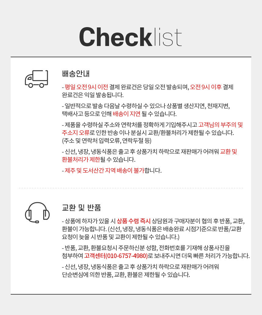| 식품 등의 표시, 광고에 관한 법률에 따른 소비자안전을 위한 주의사항 | 최종소비자는 위 보관방법을 철저히 준수하여야 하며 신선식품으로 변질의 우려가 있으니 가급적 빠른섭취 권장합니다. 보관상 부주의로 인한 손해에 대해서는 책임지지 않습니다. 부정 불량 식품 신고는 국번없이 1399 |