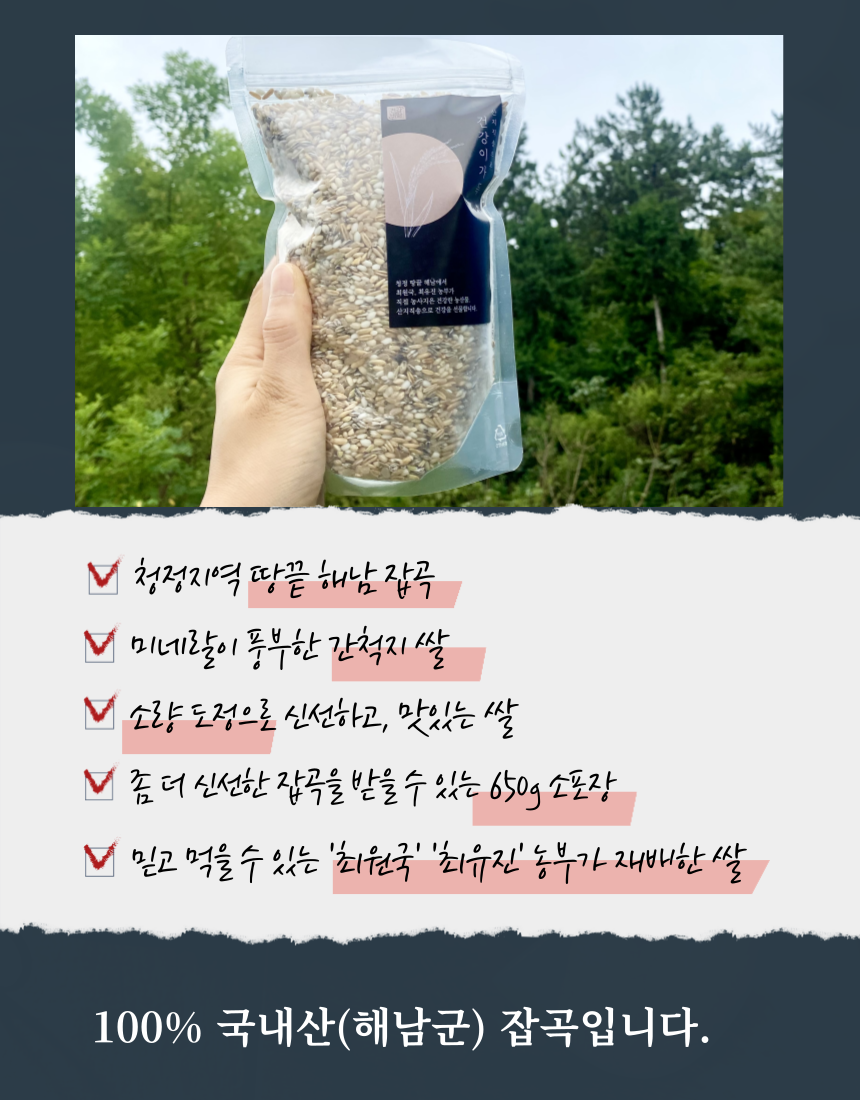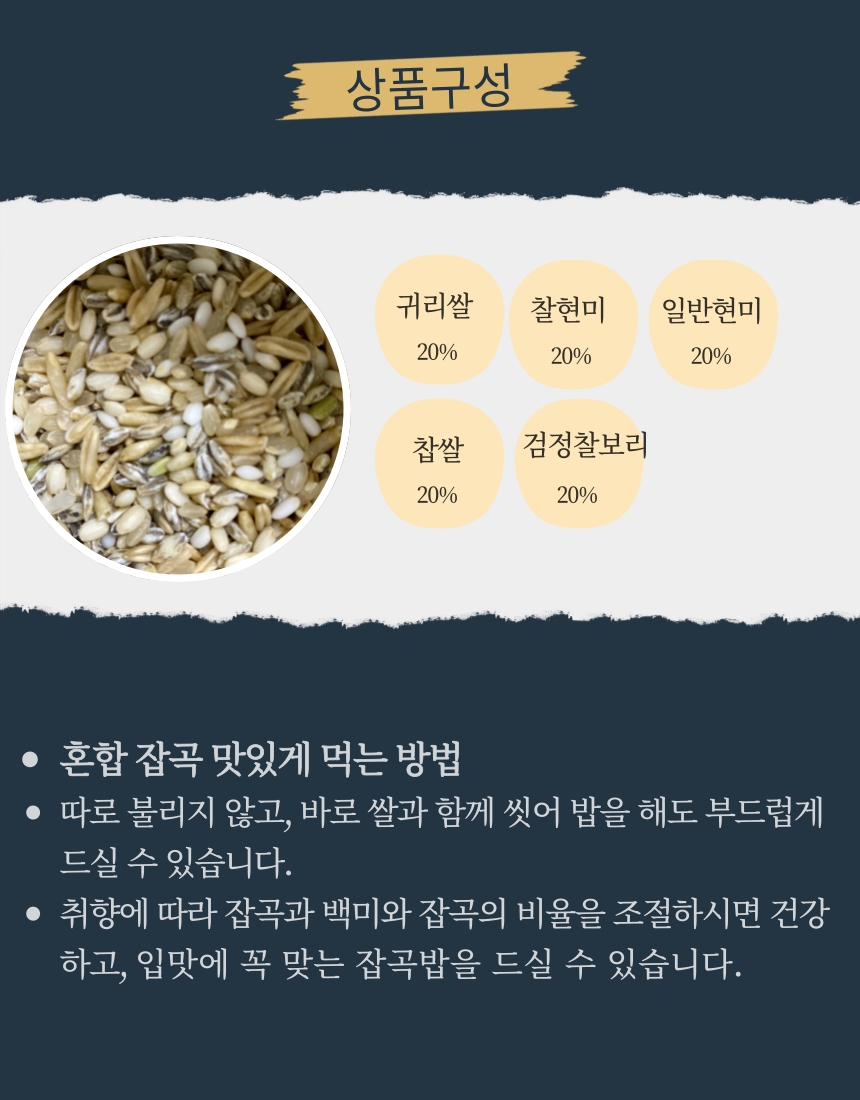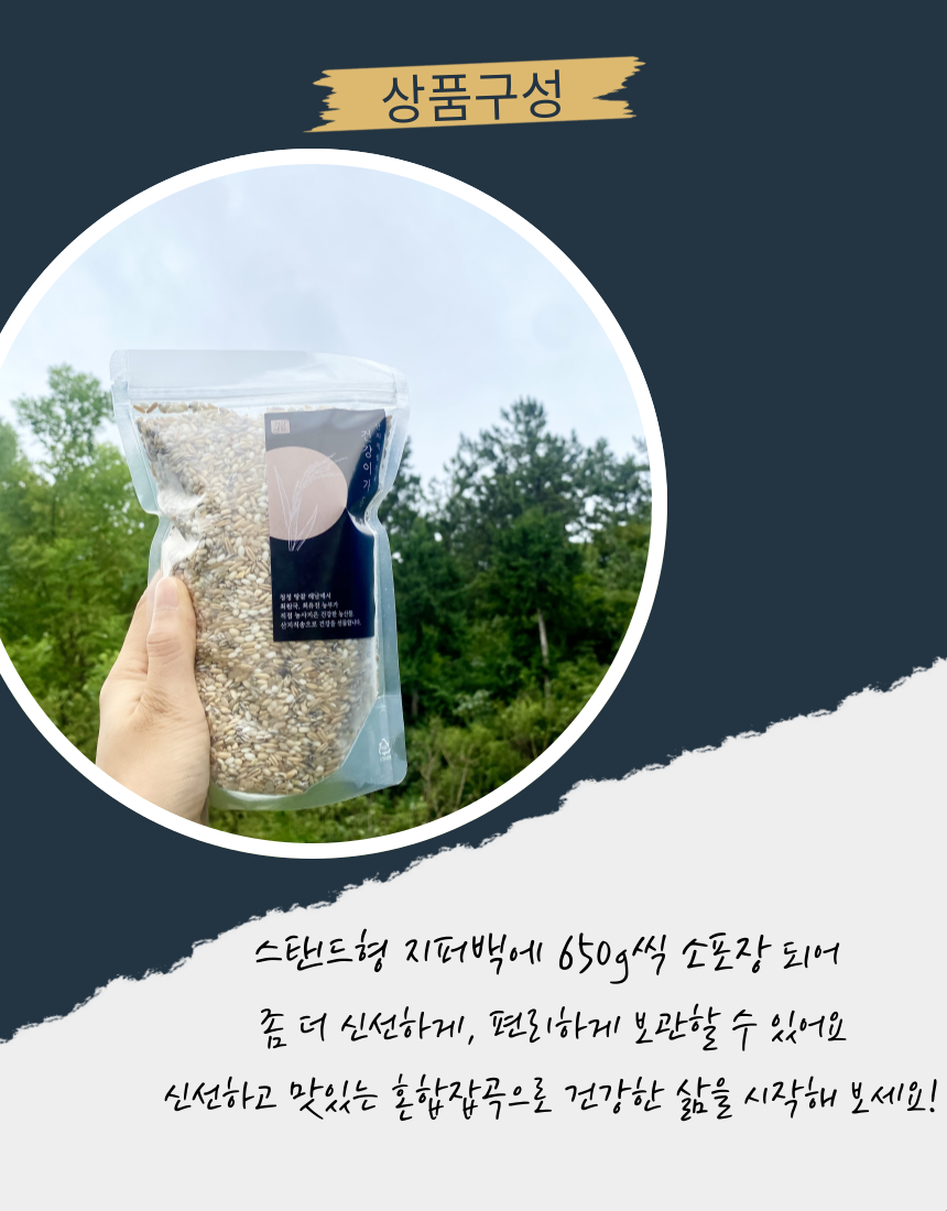 혼합잡곡 5곡 1.3kg(650g*2봉지)/24년산 귀리쌀, 검정찰보리, 일반현미, 찹쌀현미, 백옥찹쌀 각 20% 비율로 혼합